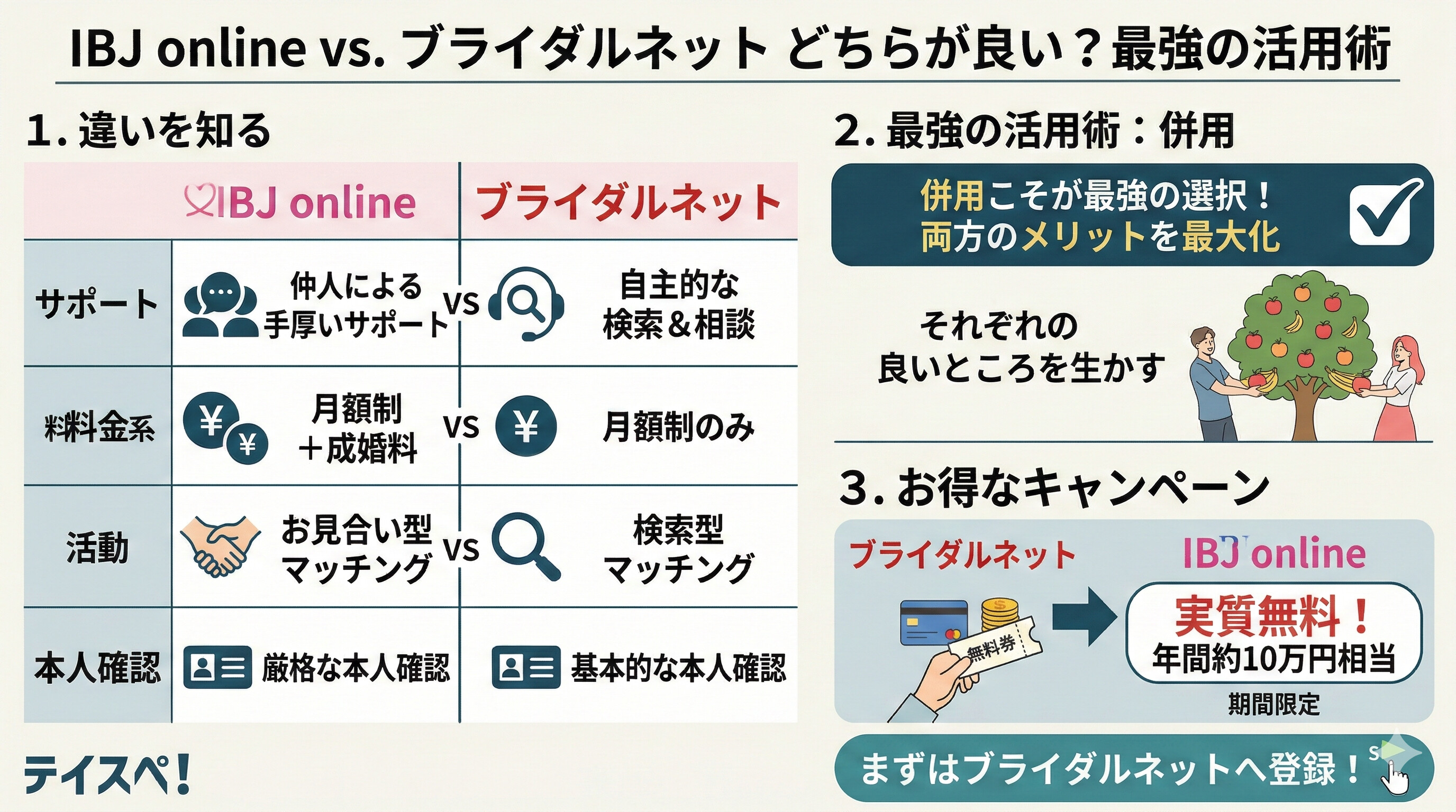 迷ったら「ブライダルネット登録 → 有料会員 → IBJ online無料併用」が後悔しにくいです。